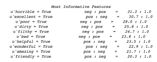 这种方法最容易实现,它最大的优点在于完全透明。在处理时我们会知道分类器发现了一组包含强烈的正面或强烈负面信息的单词,所以我们可以用这种方法对句子进行分类。