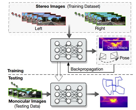 2.利用训练过程中的双目图像对,不仅估计了姿态还估计了稠密的带有绝对尺度的深度图;