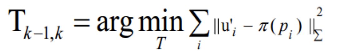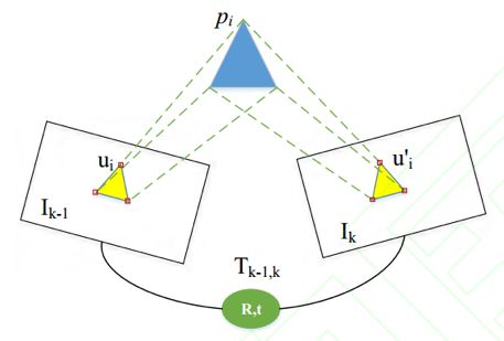 其中 ui 为 Ik-1 中任意像素点,它投影到空间点的坐标为 Pi, u′i是 Pi 投影到 Ik 上的坐标。之后利用中间层的数值来估计周围环境的三维模型和相机运动。