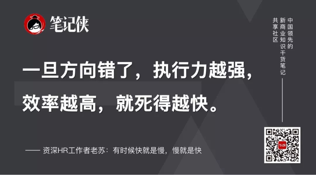 有时候快就是慢,慢就是快。一旦方向错了,那执行力越强,效率越高,就死得越快。意同南辕北辙。这也就要求企业战略的正确性和领导力的高水准。