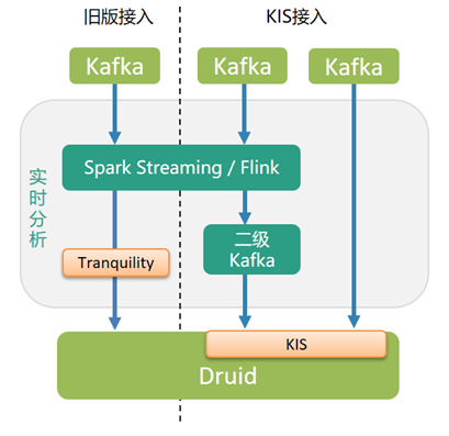 在RAP 2.x版本中,支持用户选择使用KIS接入Druid。当选择了KIS接入,如果用户的Kafka数据源版本在0.10.x及以上且没有进行数据处理,RAP会直接将Kafka数据源按配置通过KIS接入Druid;反之,如果Kafka数据源低于0.10.x或使用了数据处理,RAP会将数据处理的结果投递到RAP管理的公共Kafka集群,再通过KIS接入Druid。同时,在2.x版本中,RAP已经支持设置HLL Sketch独立计数指标(RAP 1.x使用Approximate histogram进行独立计数,其误差较大、且没有置信区间)。