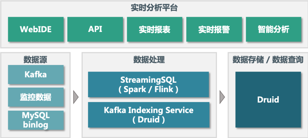 根据典型场景的需求,我们综合评估了常见的几款OLAP引擎,最终选择Druid(Druid是一款开源的为时序数据设计的亚秒级查询延迟的数据存储引擎,主要用于进行OLAP聚合分析。)做为RAP的底层OLAP引擎。针对实时聚合分析场景(绝大部分是时序数据),Druid是更适合使用的数据引擎。基于Druid,我们设计了第一代的实时分析平台 RAP。