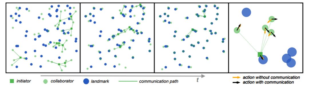图 4:ATOC 智能体之间关于协作导航的通信可视化。最右边的图片说明在有无通信时,一组智能体采取的行动。