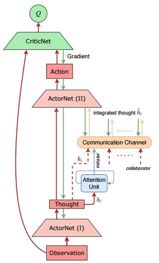 本论文研究者认为解决该问题的关键在于通信,这可以增强策略间的协调。MARL 中有一些学习通信的方法,包括 DIAL [3]、CommNet [23]、BiCNet [18] 和 master-slave [7]。然而,现有方法所采用的智能体之间共享的信息或是预定义的通信架构是有问题的。当存在大量智能体时,智能体很难从全局共享的信息中区分出有助于协同决策的有价值的信息,因此通信几乎毫无帮助甚至可能危及协同学习。此外,在实际应用中,由于接收大量信息需要大量的带宽从而引起长时间的延迟和高计算复杂度,因此所有智能体之间彼此的通信是十分昂贵的。像 master-slave [7] 这样的预定义通信架构可能有所帮助,但是它们限定特定智能体之间的通信,因而限制了潜在的合作可能性。