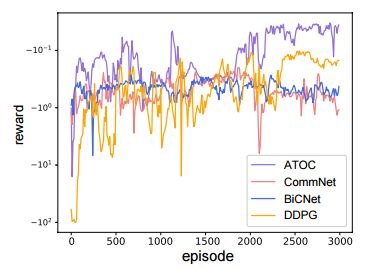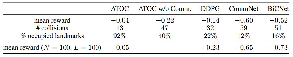 研究者将 ATOC 实现为端到端训练的 actor-critic 模型的扩展。在测试阶段,所有智能体共享策略网络、注意力单元和信道,因此 ATOC 在大量智能体的情况下具备很好的扩展性。研究者在三个场景中通过实验展示了 ATOC 的成功,分别对应于局部奖励、共享全局奖励和竞争性奖励下的智能体协作。与现有的方法相比,ATOC 智能体被证明能够开发出更协调复杂的策略,并具备更好的可扩展性(即在测试阶段添加更多智能体)。据研究者所知,这是注意力通信首次成功地应用于 MARL。