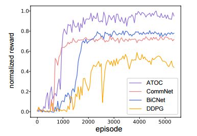 图 3:在协作导航训练期间,ATOC 奖励与基线奖励的对比。