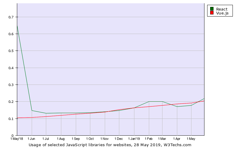 那么,从现在开始的 5 年内,哪个框架会占据统治地位呢?没有人知道。但是,可以肯定地说,在原生 JS 生态系统中,这将是一个大有可为的方面。在这个生态系统中,Web 组件统治了 DOM。React 居 NPM 下载量之后。然而,看看这些数字: https://w3techs.com/technologies/comparison/js-react,js-vuejs 在实际的 Web 使用中,差距似乎非常小。