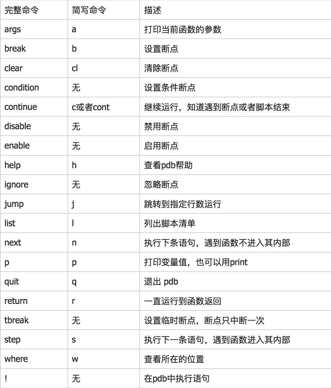pdb 是 Python 自带的库,为 Python 提供了一种交互式的源码调试功能,包含当前调试器应有的功能,包括设置断点、单步调试、查看源码等。其实如果你之前学过 c/c++ 的话,你可能知道 gdb 这个命令行调试工具,如果你之前用过 gdb,那么恭喜你你可以直接用 pdb 了,因为这哥俩一个用法。如果你不知道 gdb 也没事,我们先来看一下 pdb 的部分调试命令(截图来自脚本之家):