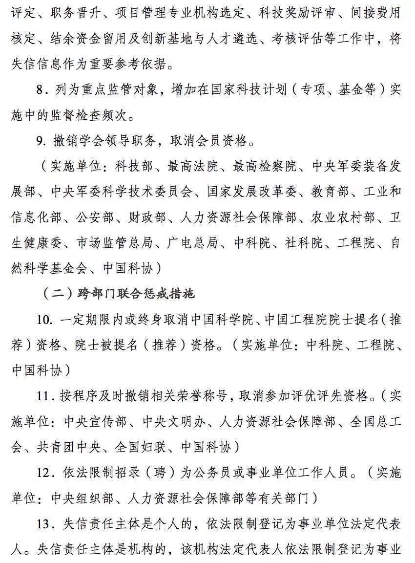 《备忘录》明确,实施联合惩戒的对象是在科研领域存在严重失信行为,列入科研诚信严重失信行为记录名单的相关责任主体,包括科技计划(专项、基金等)及项目的承担人员、评估人员、评审专家,科研服务人员和科学技术奖候选人、获奖人、提名人等自然人,项目承担单位、项目管理专业机构、中介服务机构、科学技术奖提名单位、全国学会等法人机构。