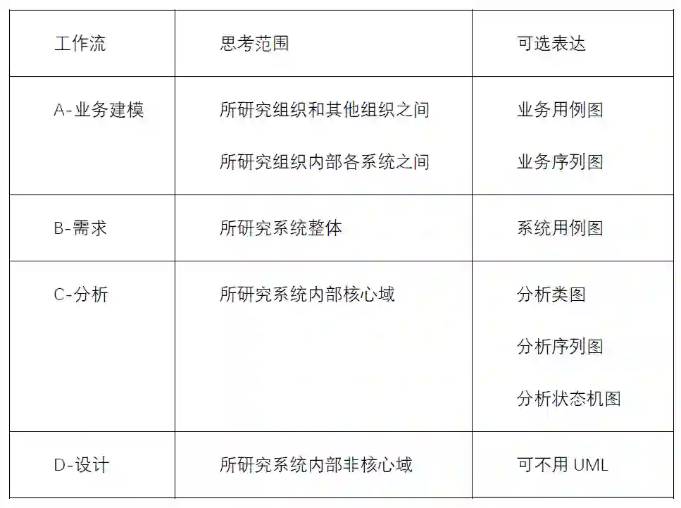 以上四个工作流的名称使用了传统术语,也有一定的模糊性(特别是业务建模)。其实我觉得更贴切的名称是组织建模、需求建模、核心域建模、实现。如果您觉得业务建模、需求、分析、设计不好,直呼ABCD或改成阿猪、阿狗、阿鸡、阿鸭也无所谓。