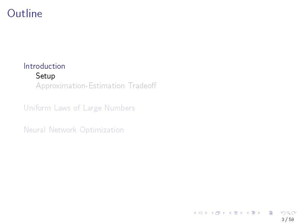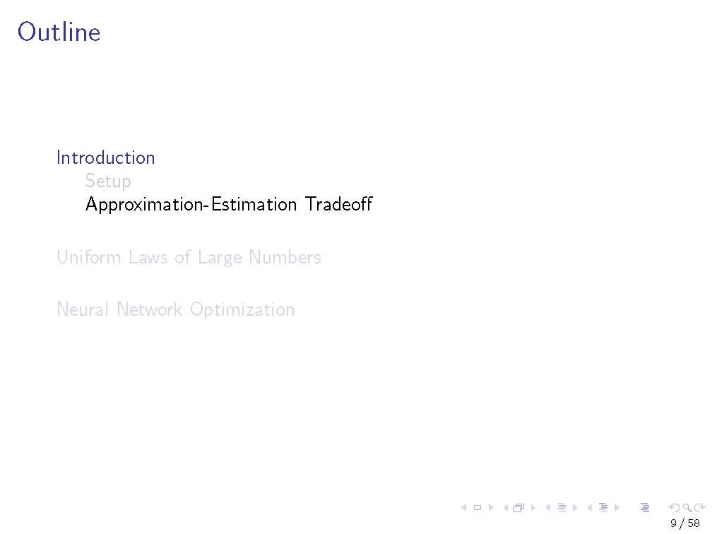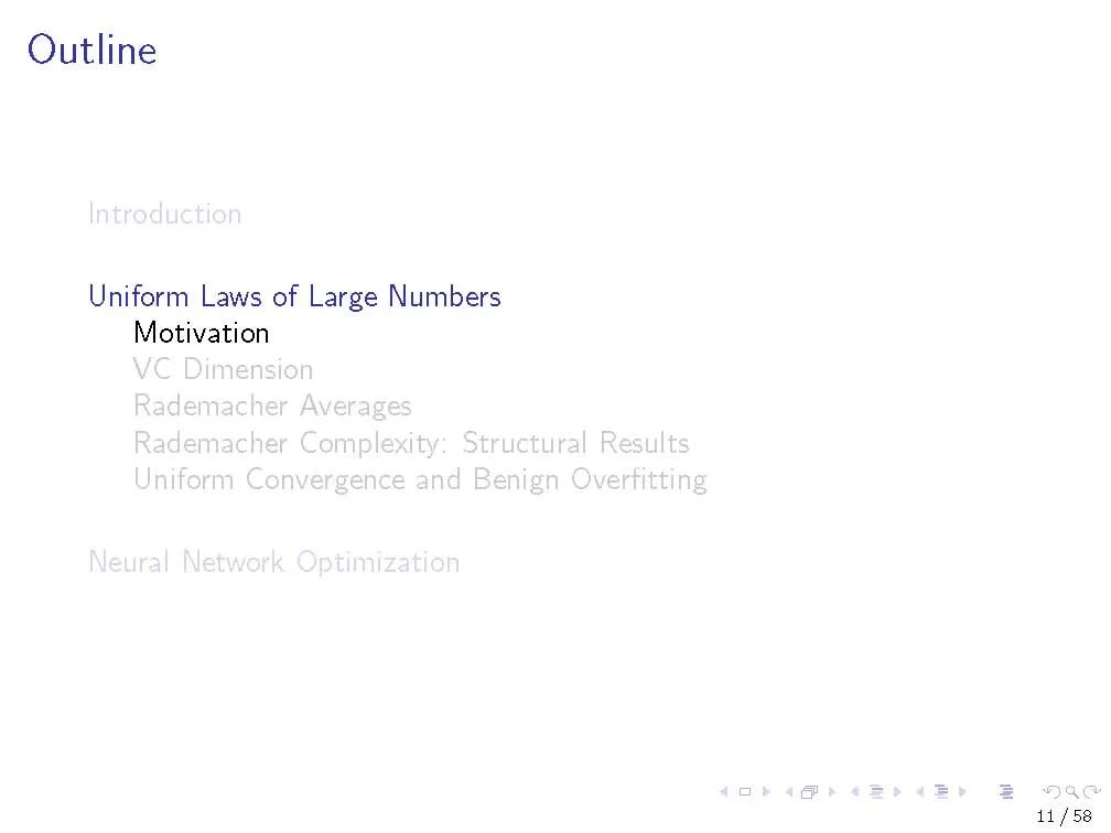 在第一个教程中,我们回顾了来自经典统计学习理论的工具,这些工具对理解深度神经网络的泛化性能很有用。我们描述大数的统一定律,以及它们如何依赖于感兴趣的函数类的复杂性。我们专注于一个特定的复杂性度量,Rademacher复杂性,以及深度ReLU网络中这种复杂性的上界。我们研究了现代神经网络的行为如何与在经典设置中发展的直觉相冲突。