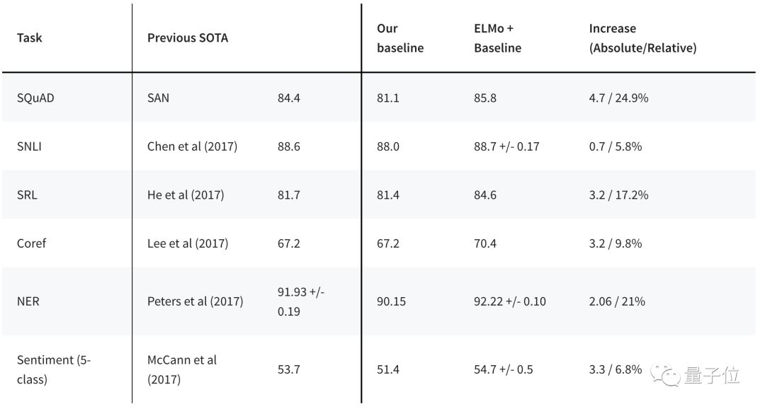 当然,ELMo也在试验中展示出了强大功效。把ELMo用到已有的NLP模型上,能够带来各种任务上的性能提升。比如在机器问答数据集SQuAD上,用ELMo能让此前最厉害的模型成绩在提高4.7个百分点。