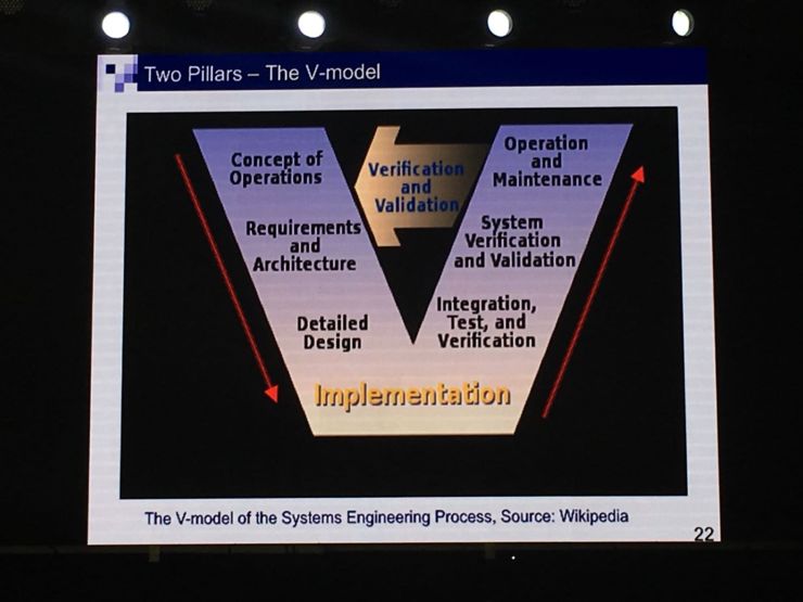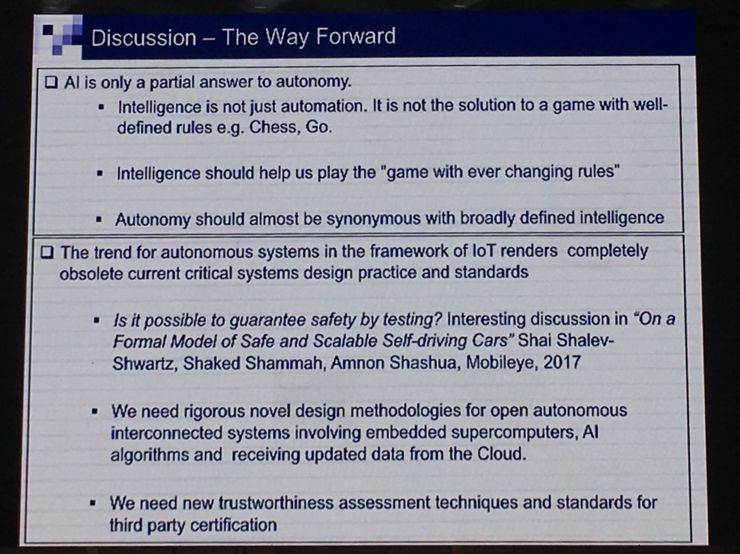 现在,我们有很多硬件平台,为了开发一个可靠的模式,在这个模式下,我们需要验证这个系统,并且还会出现很多可能的失误。因此,系统验证是一个非常难的任务。我们需要理解的非常重要的一点是,虽然自动系统中有机器学习技术,但是我们也没有办法来验证机器学习。因为在神经网络中,当你开发一个神经网络的时候,而没有办法对神经网络进行验证。因为没有(对神经网络的)要求,所有没有办法来验证这个神经网络,这就意味着神经网络没有办法用来系统地验证。