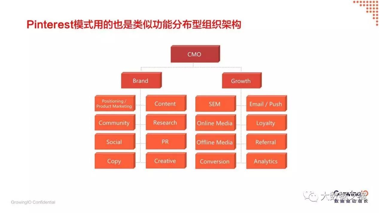 再来看一下Pinterest的增长团队架构,他们公司负责增长的团队是划在增长部门里面,但更偏重在以转化为核心的营销部门。