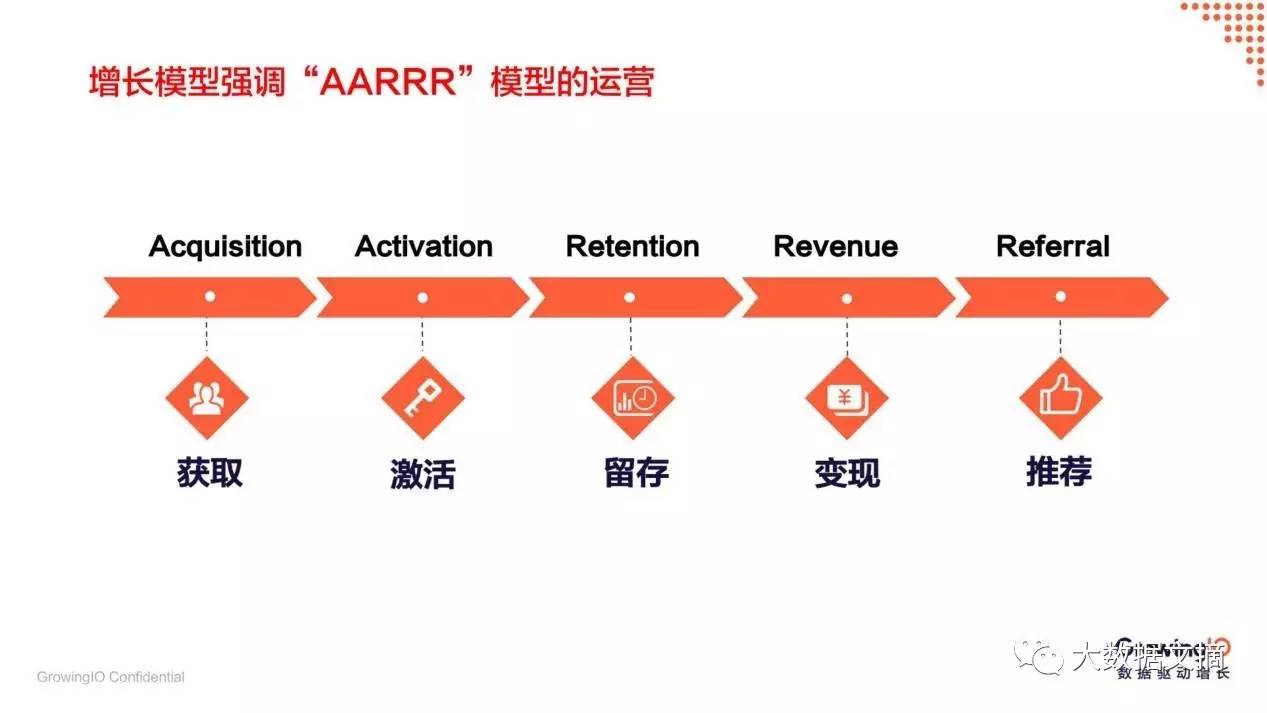 这实际上是需要负责人从流量型思维向客户型思维转化。流量型的思维是指通过多平台多渠道打广告的方式获取客户,拉取流量。这种方式成本低,能大量吸引新的客户,但是赚完这些客户的钱以后,就把他们抛弃了。客户型的思维就是利用高成本的广告或方式获取客户,并对客户进行再运营,不断从既有的客户身上获取价值,甚至通过客户创造更多的价值。我们可以参考“增长黑客”增长模型的五个环节: