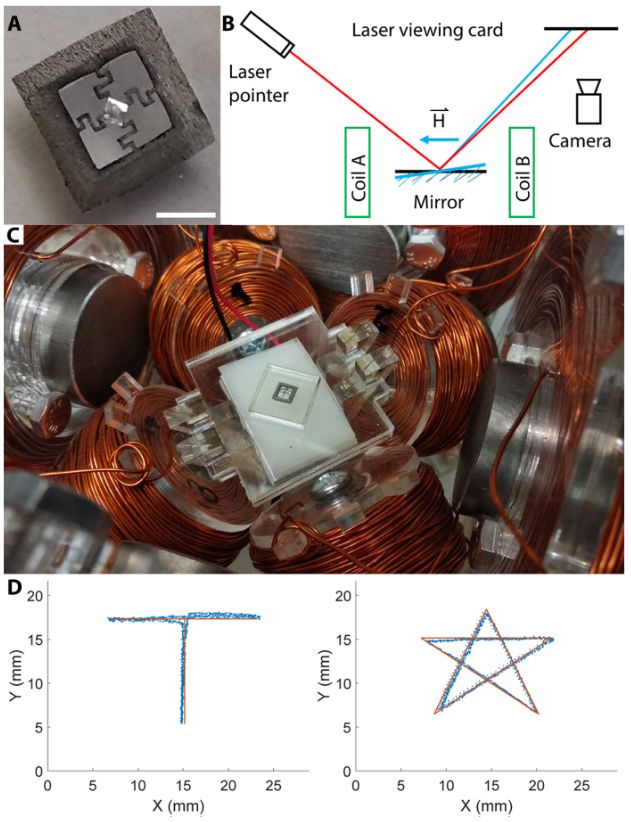 图7 用于激光转向的非受限型磁镜安装座。(A)镜架图,中间装有一个小镜子。该结构的磁化分布如图2L所示。比例尺:2mm。(B)激光转向实验示意图。(C)实验中使用的线圈系统。(D)激光的目标轨迹(橙色)和实验轨迹(蓝色)。T形和星形轨迹的跟踪频率分别为0.5Hz和0.2Hz。