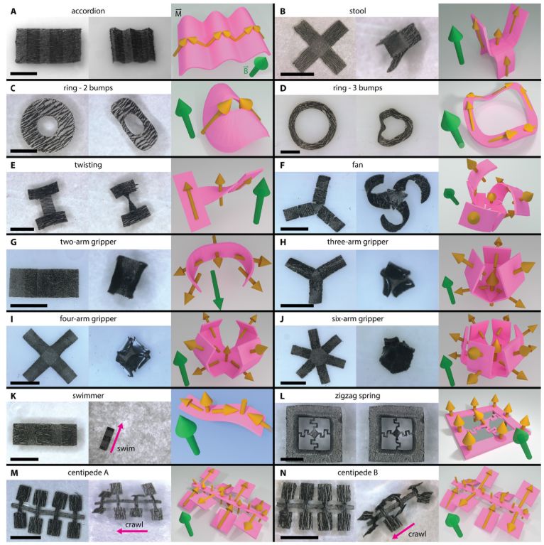 为了验证他们的新技术的能力,研究人员设计了 20 多种不同的机器人形状,然后将其编程到 3D 打印机。然后打印机构建并固化设计,磁性颗粒定向是这个过程的一部分。