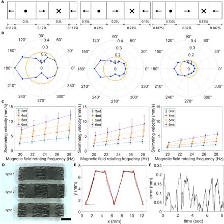 图4:毫米级分段磁性swimmer。(A)三种类型swimmer的磁化曲线。长L为4.5毫米。(B)模拟swimmer的TWC分析。蓝色标记表示每个阶段的形变,黄色虚线表示一个周期中的等效形变圆。(C)swimmer在不同条件下的实验游泳速度。实心三角形代表六个样本的平均值,误差条代表SD。(D)在一个过程中由相同前体制造的分段swimmer。比例尺:1mm。(E)磁性swimmer的追踪路径。(F)磁性swimmer的路径跟随误差。
