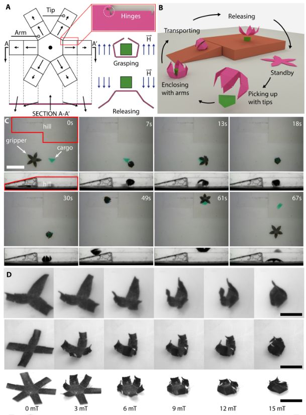 图5:非束缚性多臂磁性微夹钳。(A)磁性微夹钳的几何形状,磁化曲线和工作结构。黑色箭头表示每个组件的局部磁化方向,蓝色箭头表示驱动磁场。(B)货物运输任务示意图。(C)在硅油中货物运输任务的俯视图和侧视图。硅油用于提升体重并减缓夹具的形变,使开环控制更容易。比例尺,5mm。(D)不同场强下不同微夹钳的特写图像。比例尺:2mm。
