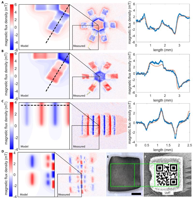 图8 不同样品近表面的磁通量分布。以及沿(A)六臂磁性微夹钳(前),(B)六臂磁微夹钳(后),(C)折叠结构(D)多足桨式爬行机器人。数据收集自距样品表面60μm处,使用最小二乘拟合将模型中的磁化强度拟合到测量数据中。(E)带有磁二维码“UofT”的聚合物薄片。比例尺:2mm。(F)为相对于(E)的二维码样品的表面处测得的磁通量。