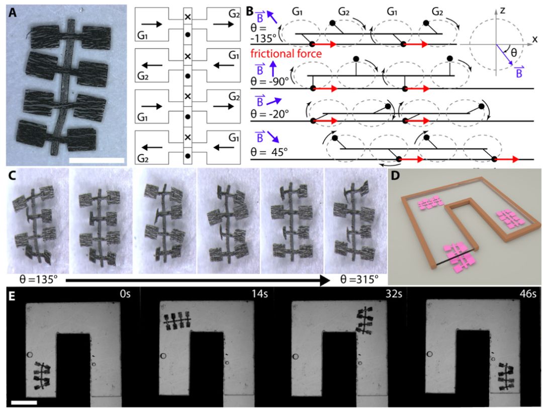 图6 多足桨式爬行机器人。(A)桨式爬行机器人的图像和磁化曲线。局部磁化用黑色箭头表示。当标记为G1的腿执行动力冲程时,标记为G2的腿执行恢复冲程,反之亦然。比例尺,2毫米。(B)侧面步态的示意图。(C)不同阶段的机器人的俯视图。(D)微通道示意图。通道的横截面为4.7毫米×1.0毫米。(E)俯视图,显示机器人在填充有硅油的微通道中的运动。硅油用于提升体重并减慢机器人的行程运动,使摄像机能够清晰地捕捉到运动。水中的冲程运动和机器人的速度相对更快。比例尺:4mm。