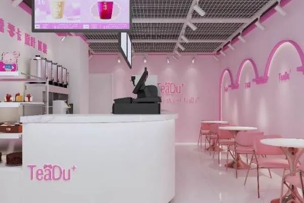 与品牌名的可爱风类似,茶嘟嘟门店以粉色系作为主色调,选址定位在步行街、学校、社区、商业综合体、写字楼、美食街等开设门店,面积在20-70m²之间。