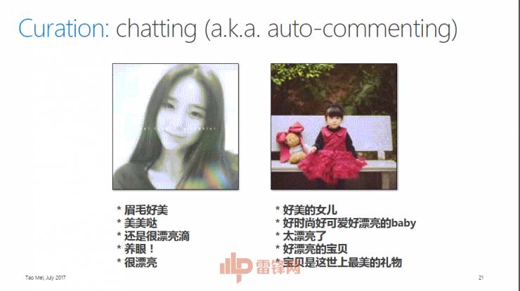 这是我们生成的一个视频(见PPT)。小冰能够做auto-commenting(自动评论),不仅告诉你很美,还能告诉你美在什么地方。后面是一个小孩子,它说你的女儿很漂亮、很时尚。基本上它可以给自拍的视频做评论,给小孩的视频做评论,也可以给宠物视频做评论。