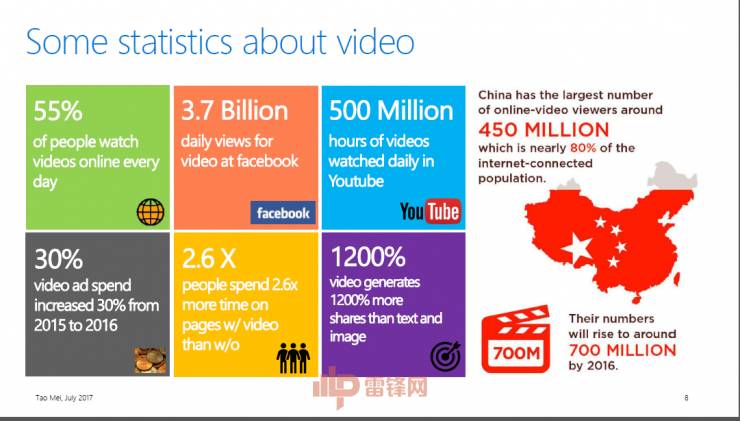 梅涛博士从三个方面讲了他为什么想和大家分享「视频内容」这个话题。首先视频跟图像相比信息更丰富,处理起来也更富挑战性;其次,计算机视觉技术领域,如人脸识别,人体跟踪等研究的比较多,而互联网视频内容相对来说研究的比较少;最后,他说在十年前就开始做视频方面的研究,所有人都说视频是下一个风口,今天看来这个说法也是对的。