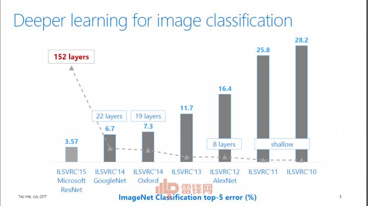 大家看一下这个图(见PPT),Image Classification(图像分类)从最早8层到20多层,到现在我们的152层。我们在微软做了很多工作,image里面有很多image recognition computational style transfer(图像识别计算的风格转换)等等。微软跟这个相关的产品有很多,比如说小冰不仅可以跟你用文字聊天,还可以通过图片和视频跟你交流。