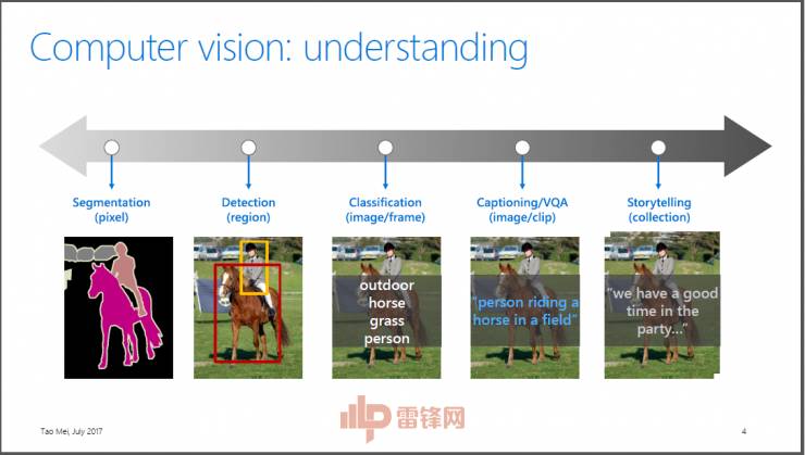 我们今天讲的是视频理解,如果从理解一个像素或理解一个图片或视频来说,可以把这个理解问题分成几个层次。最难的是需要理解图片或视频里面每个像素代表什么标签。再往上是我们关心每一个物体在什么位置、属于什么类别。第三部分是不关心这个物体在什么地方,你给我一图片或者视频,我就知道这个图片或者视频里面有什么标签。再往前走一步,比如说我给你一个图片,要求不仅要生成单独的标签,还要看你能不能生成一个非常自然的语言来描述这个图片。再往上,我给你一个图片,能不能给我一个故事,比如说现在机器能不能产生这样一个故事。