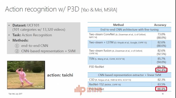 这是我们今天讲的唯一的一个技术性的部分。我们最近做的一个非常好的工作,就是可以做深层次的网络,我们可以通过一些方式使得深层次的网络是可行的。比如说这个到现在可以做到152层,也可以做到1001层,性能超过了任何网络。我们能不能从这个网站的图片扩展到视频?我把二维的卷积盒变成三维的,当它卷积的时候是沿着X、Y和T这个方向卷积的。C3D模型是可以做到13层,它非常复杂。我们有一个想法,把它进行分解,一个是可以找出这个物体的数量,使的这个过程可行,另外还可以在图像上进行处理。我们做了很多工作,比如说这个视频是一个太极的动作,我们通过P3D可以找出来4个点,这个已经非常了不起了。