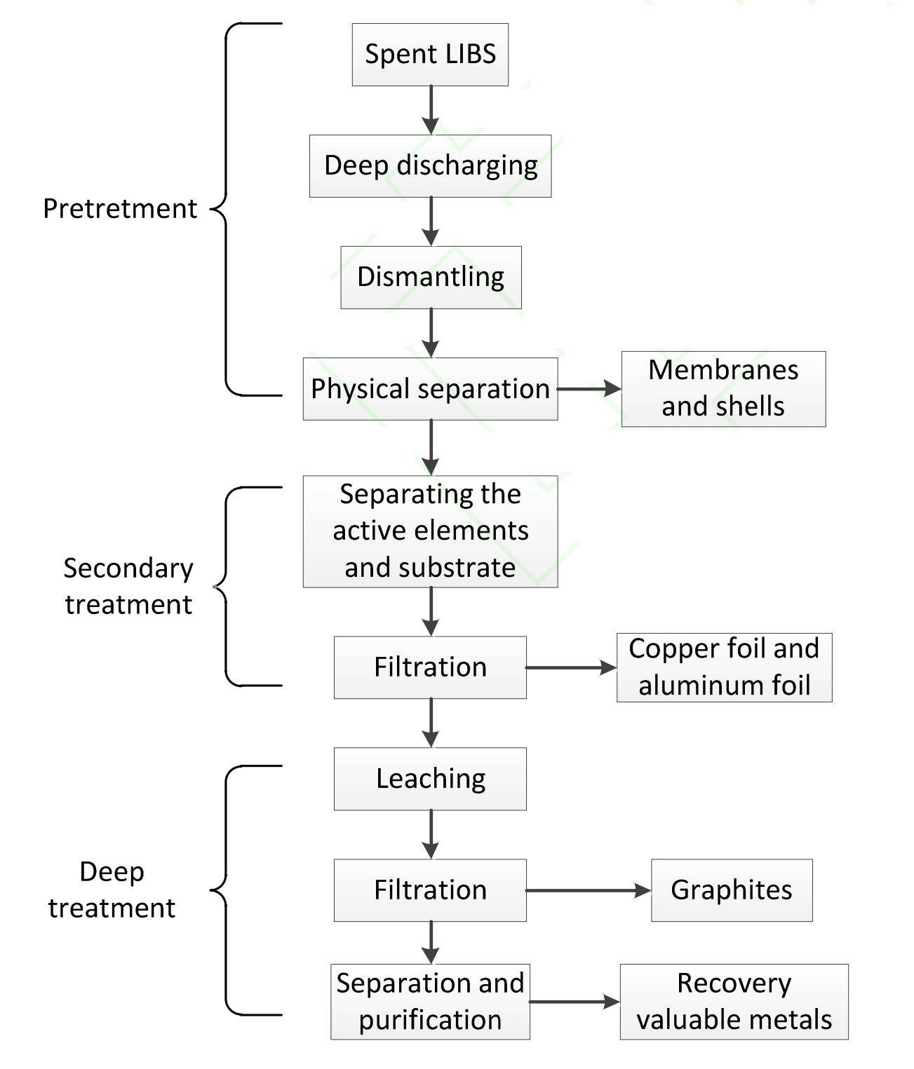 深度处理步骤主要包括浸出和分离提纯两个过程。浸出过程主要有酸浸和微生物浸出两种方法,分离提纯过程主要有沉淀法、萃取法和电化学法。