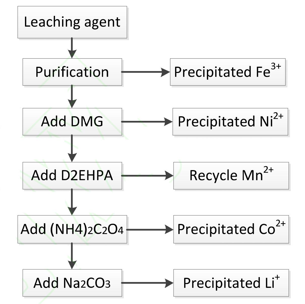 分离提纯过程主要有化学沉淀法,溶剂萃取法,电化学法,目的在于对浸出液中的重金属离子(Co2+、Li+、Ni2+、Mn2+、Cu2+、Al3+等)进行分离提纯回收。