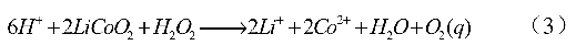 酸浸法是应用很广泛的一种浸出方法,很多研究报道通过运用无机酸(盐酸[30],硫酸[31],硝酸[32])和有机酸(柠檬酸,草酸,抗坏血酸,葡萄酸等)来浸出锂离子动力电池正极材料。由于 Co3+ 难溶,因此一般需要添加 H2O2 作为还原剂,以 LiCoO2 为例,化学反应方程式如公式(3)所示: