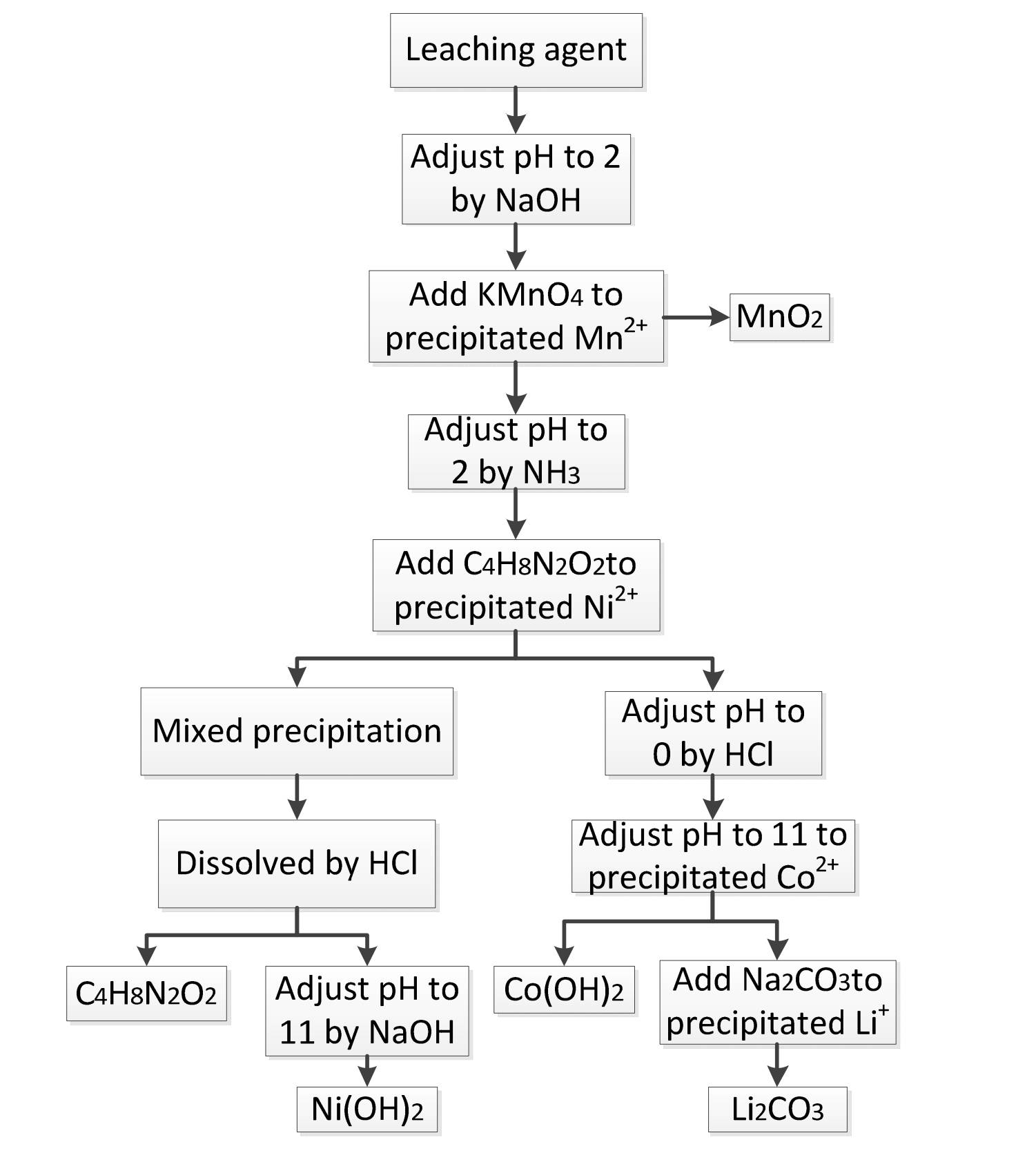 化学沉淀法只需控制溶液的 pH, 加入特定的沉淀剂,易于实现工业化生产,回收率较高,成本较低。但由于浸出液含有多种金属离子,在沉淀过程中不可避免的会出现几种离子共同沉淀的情况,从而导致最后得到的沉淀产品中含有杂质,纯度不高。