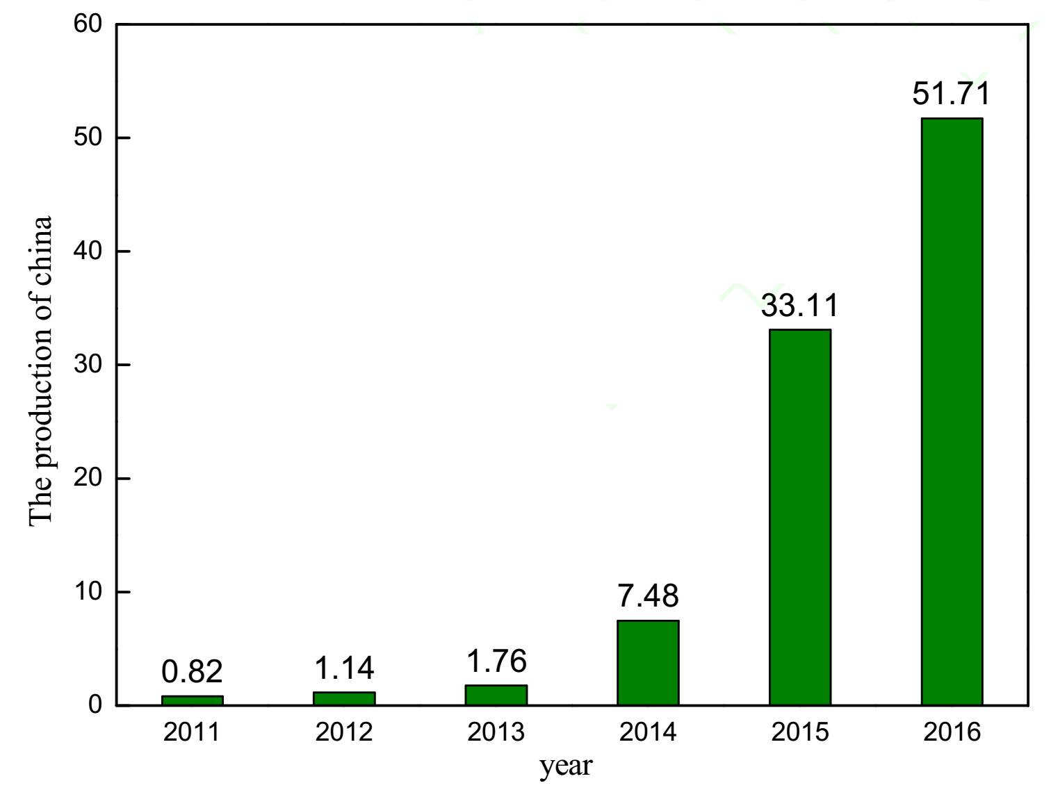 图 1 2011 ~ 2016 年中国电动汽车产量情况(单位:万辆)