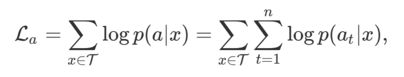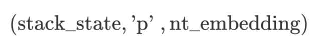 a 为状态转移系统的动作(action)序列,包括 NT,TER 和 ACT(对应原文的 RED),分别代表在栈中加入一个非终结符、在栈中加入一个终结符以及规约;