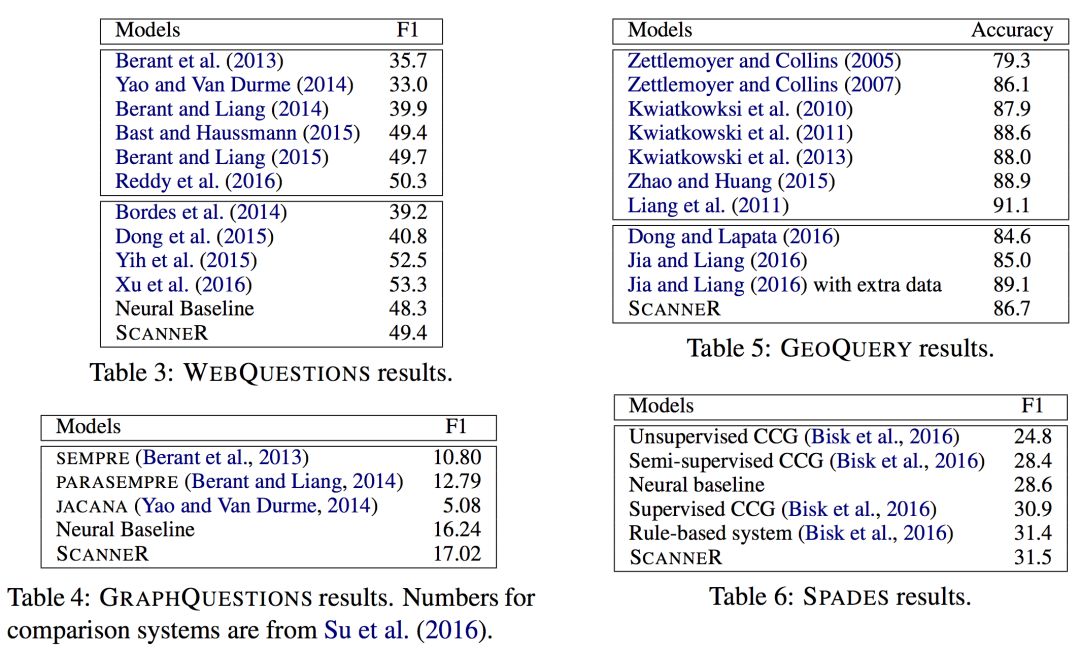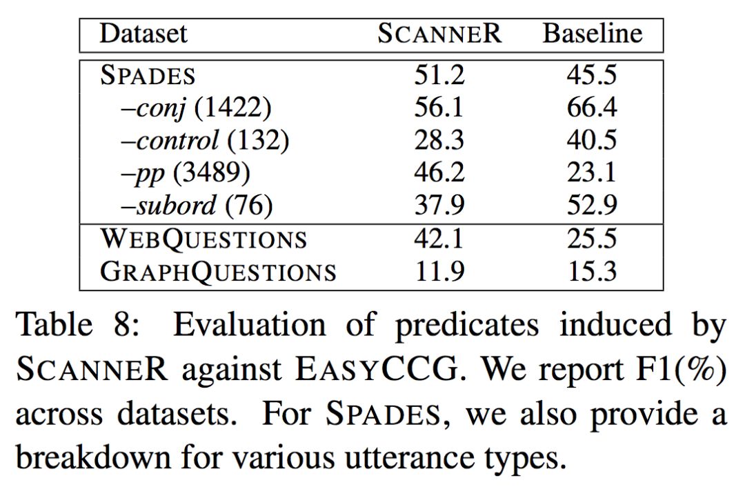 与其他方法相比,该模型没有使用外部的解析器(如 dependency parser)以及手工设计的 CCG 文法,而是采用了基于状态转移(transition-based)的方法生成谓词-参数(predicate-argument)形式的中间表达,由此避免了生成不规范形式的语义表达。
