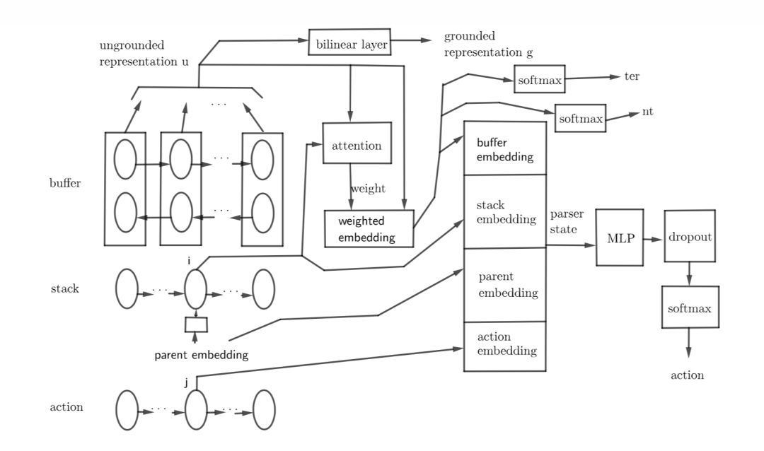 使用 stack 的当前隐层输出 stack_embedding 以及 buffer 隐层向量序列作为输入根据注意力机制来计算的权重,将 buffer 赋权累加(这里有不同的赋权累加方式)得到 buffer 的嵌入表示 buffer_embedding。