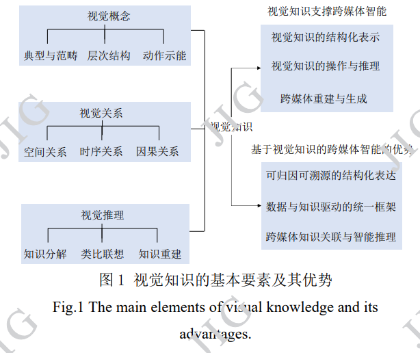 本文随后分析一种跨媒体智能研究的新途径— —视觉知识(Pan,2019)。视觉知识不仅关注图像 或视频等视觉信号,以及基于这些信号提取或学习 得到的特征,而且以视觉概念(通常由典型和范畴 构成)(Pan,2019)为研究要素,联合符号化知识 与逻辑推理、深度学习技术、知识图谱、手工构造的 知识(如结构化信息)等多种知识表达手段,将与视 觉主体相关的音频、语言等信号进行联合建模与推 理。这种性质与人类在理解和推理多媒体信号时的 处理流程是相似的——以信息量最高的视觉为主导、 并在其基础上关联语音、文字等感知与理解。这些 声音、文字等其他形式的信息又能适时地促进、增 强对环境和目标的视觉理解。这种多模态知识表达 互相增强的性质,也正是视觉知识所具有的多重知 识表达能力(Pan,2020;Yang 等,2021)。