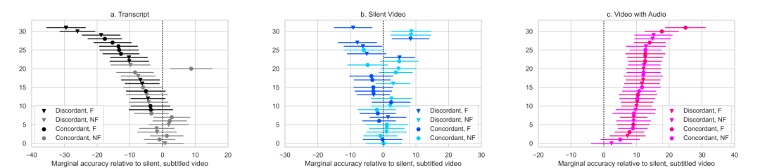 在文字记录中,受试者的平均确信度为81%。在视频和音频呈现的演讲上,受试者的确信度分别提高了6%和9%。如果把所有内容都提供给受试者,则可以让确信度提高12%。