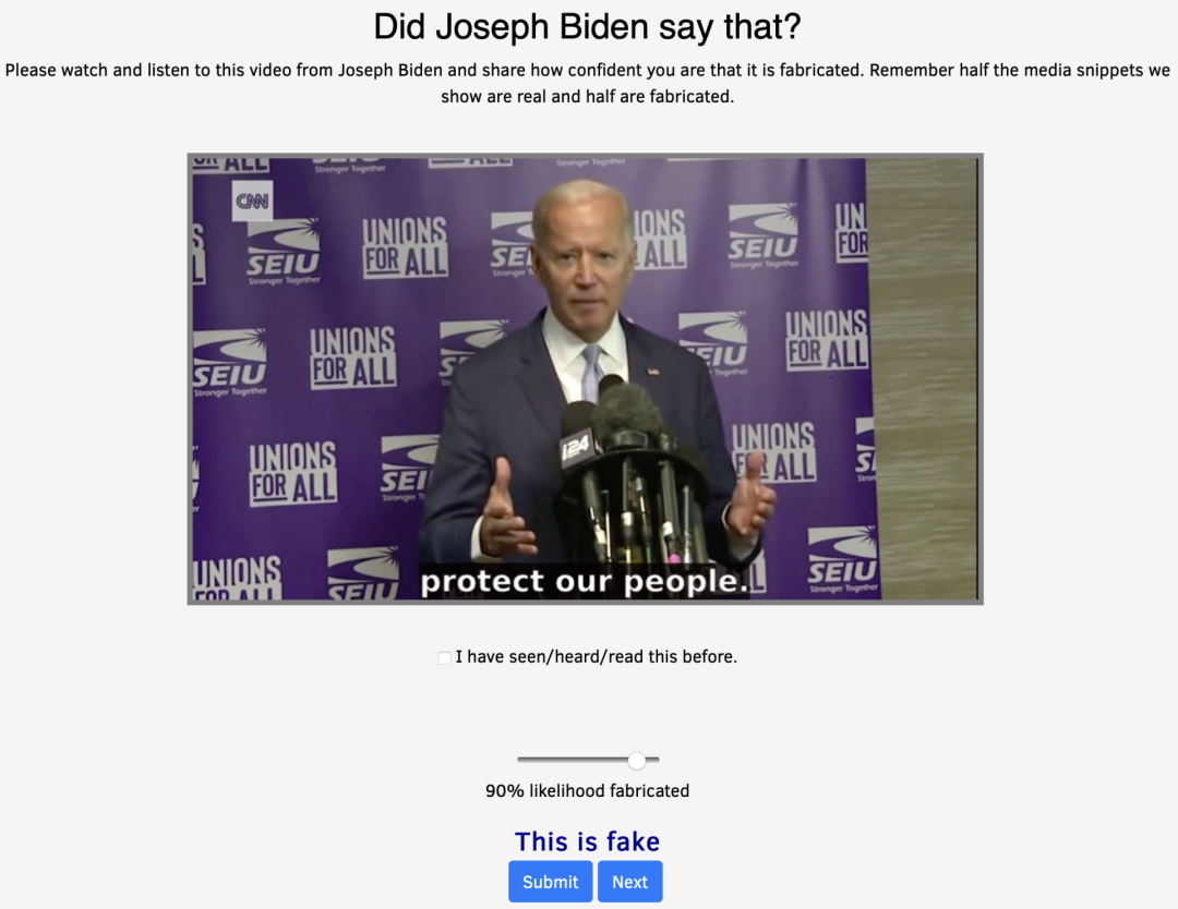 受试者被告知其中一半的内容是假的,并被询问他们认为其中哪些片段是伪造的。