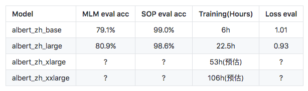 预训练序列长度sequence_length设置为512,批次batch_size为4096,训练产生了3.5亿个训练数据(instance);每一个模型默认会训练125k步,albert_xxlarge将训练更久。