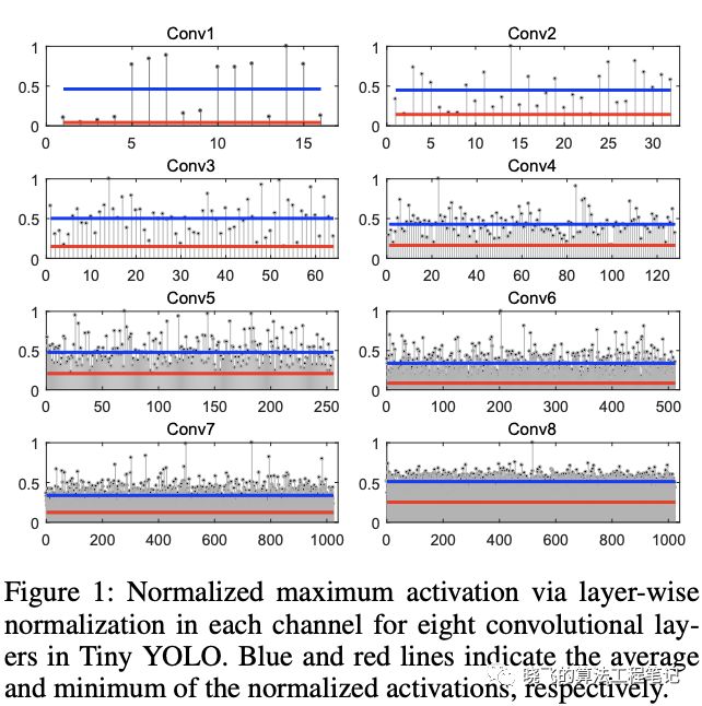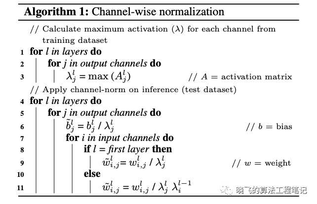 channel-wise归一化方法如公式5, 和 为维度下标, 层权值 通过在每个channel使用最大激活值 进行归一化,该值依然是从训练集计算的。对于非首层中,归一化的激活值必须乘上 来将输入还原为上一层归一化前的值,再进行本层的归一化,不然传递的信息会越来越小