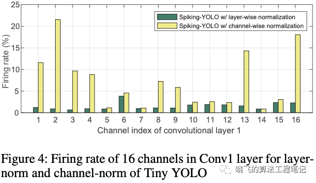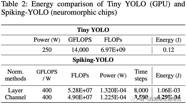 论文在实际设备上对比了Spiking-YOLO(TrueNorth chip)和Tiny-YOLO(Titan V100),因为channel-norm的发射率较高且合适,所以使用了更少的timestep,能源消耗最少