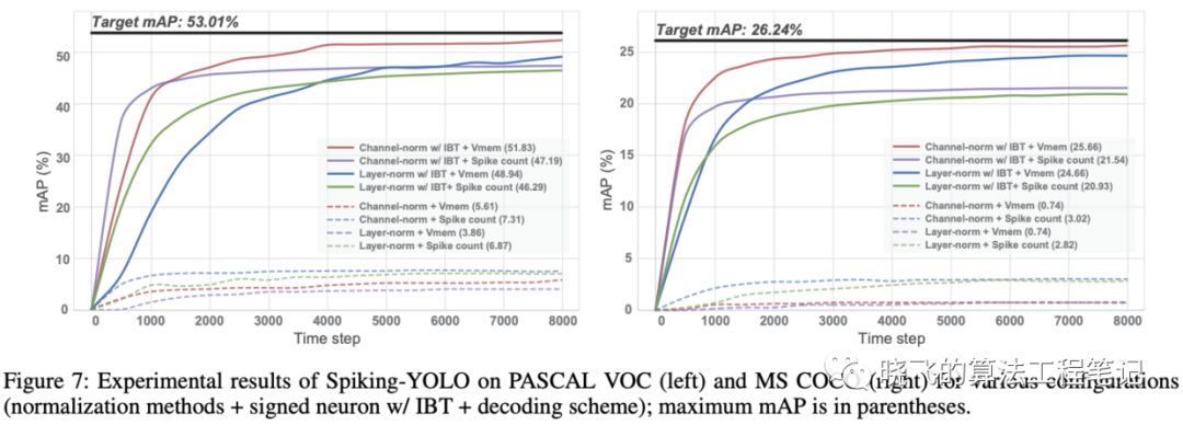实验的目的是无损地将Tiny-YOLO的转移为SNN,结果如图7所示,使用channel-norm和IBT能有效地提升性能,且使用的timestep更少