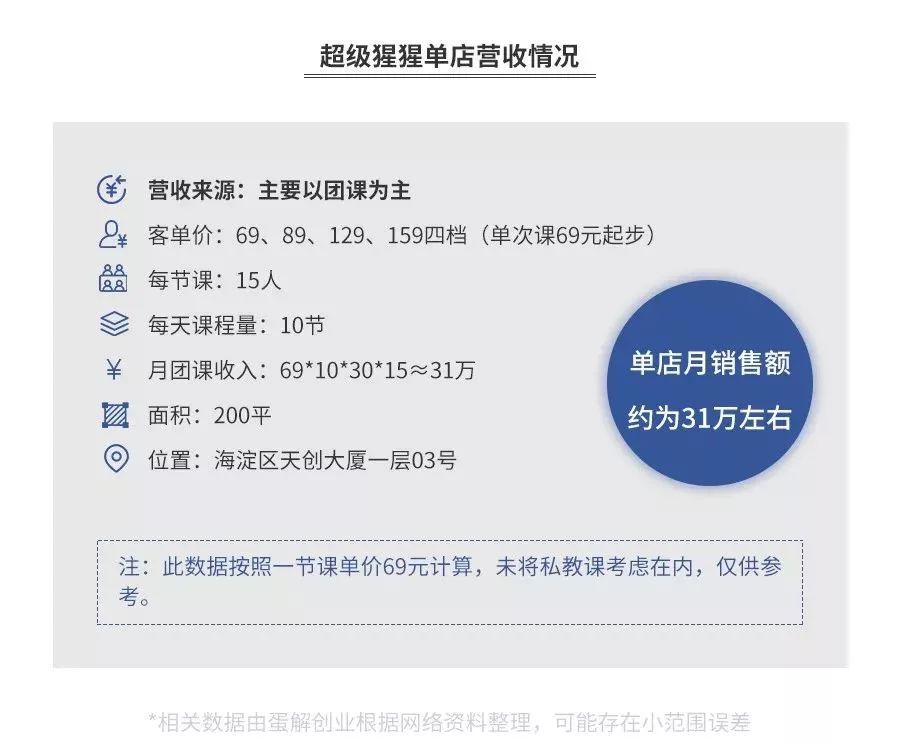 由于健身房的成本结构较为复杂,很难准确计算,此次蛋解创业编辑部只能大致推算了一下探访这家的店盈利情况,数据仅供参考。