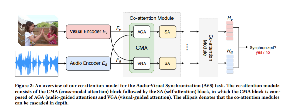 在观看视频时,视觉事件的发生往往伴随着声音事件,如唇动的声音,乐器演奏的音乐。视听事件之间存在着一种潜在的相关性,通过解决视听同步的代理任务,可以将其作为自监督信息来训练神经网络。在本文中,我们提出了一种新的带有共同注意力机制的自监督框架来学习无标记视频中的通用跨模态表示,并进一步使下游任务受益。具体而言,我们探讨了三个不同的共注意模块,以关注与声音相关的区分视觉区域,并介绍它们之间的相互作用。实验表明,与现有方法相比,我们的模型在参数较少的情况下,取得了较好的效果。为了进一步评估我们方法的可推广性和可迁移性,我们将预训练的模型应用于两个下游任务,即声源定位和动作识别。大量的实验表明,我们的模型可以提供与其他自监督方法竞争的结果,也表明我们的方法可以处理具有挑战性的场景包含多个声源。