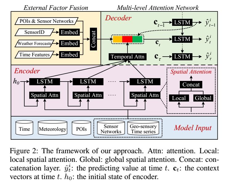 论文《GeoMAN:Multi-level Attention Networks for Geo-sensory Time Series Prediction》中提出的模型是基于编码器-解码器 (encoder-decoder) 架构设计而成。其中,编码器将历史序列的输入编码成上下文向量,解码器将上下文向量作为输入用于预测接下来各个时刻的序列值。