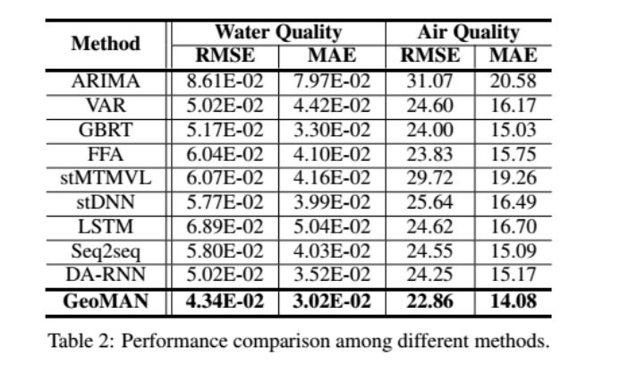 论文表明,GeoMAN 方法在多种不同数据集上(中国东南某城市的管网水质、北京市空气质量)均取得了超出现有方法的效果,并具有很强的可解释性。